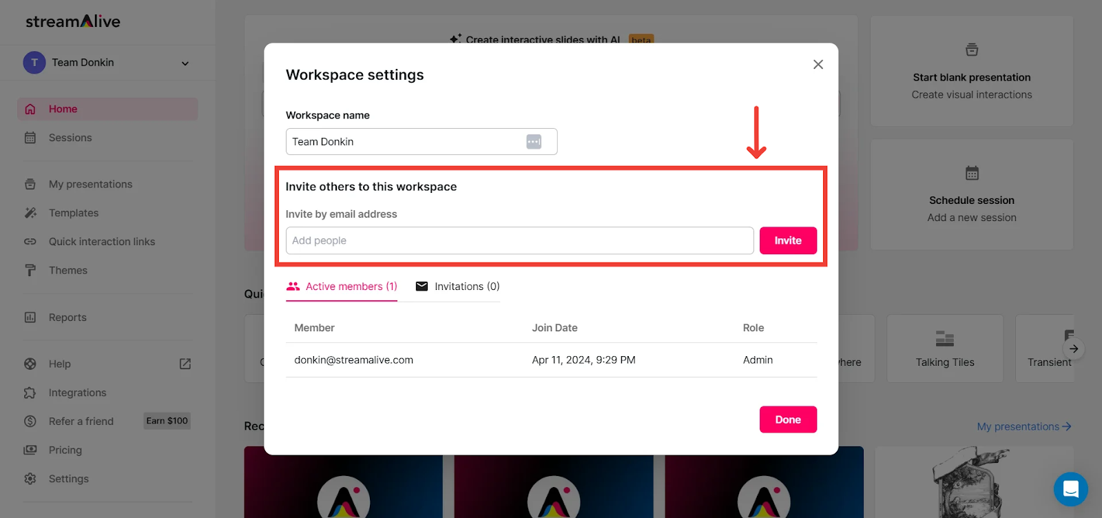 Adding team members to your workspace allows you to share the workload of creating presentations, scheduling sessions, configuring settings, and analyzing session data. Similarly, removing members when roles or responsibilities change helps maintain a streamlined team.