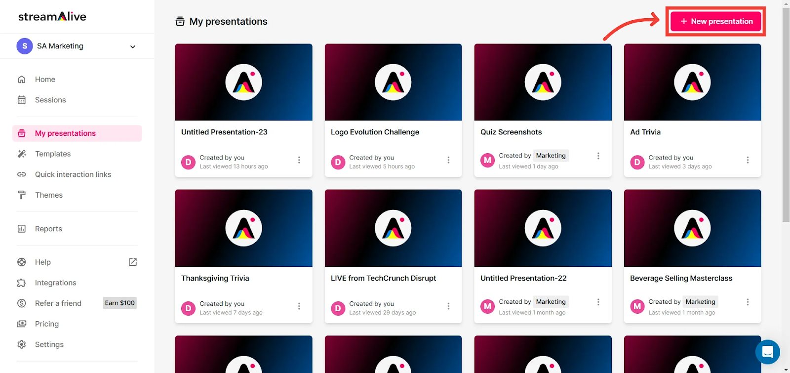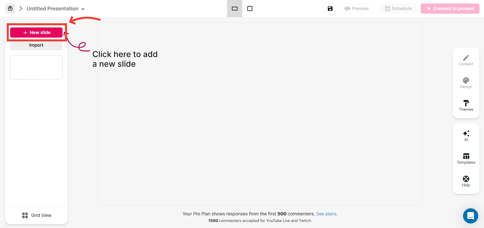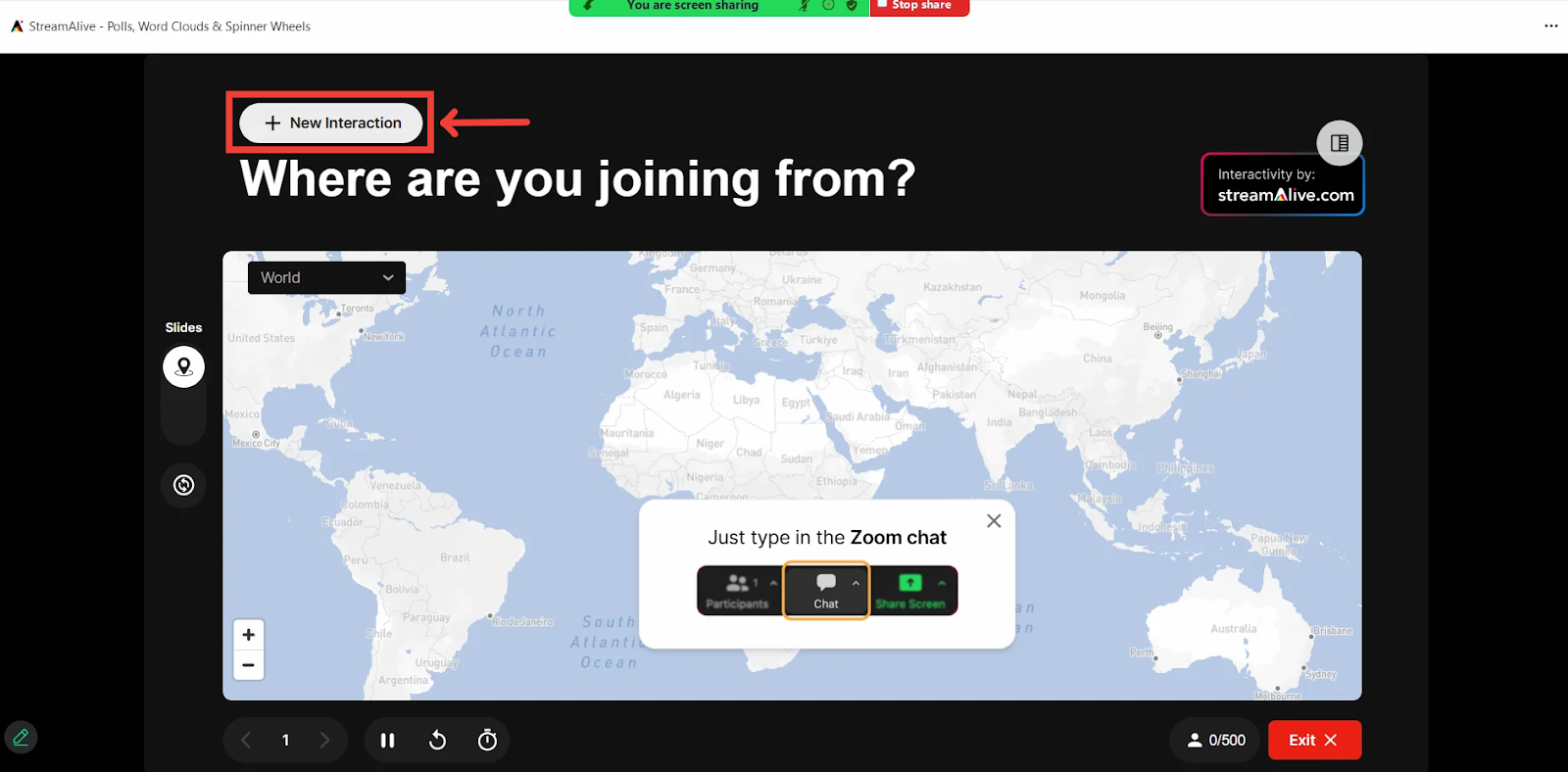 2. Once you’re connected and on the Presentation Live screen, click on the + New Interaction button