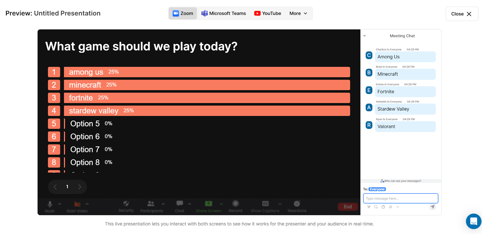 Remember: Spending time customizing your poll design in the middle of your live session is likely to be an attention killer, so consider using the presentation builder to create your interactions in advance if you plan on customizing them.