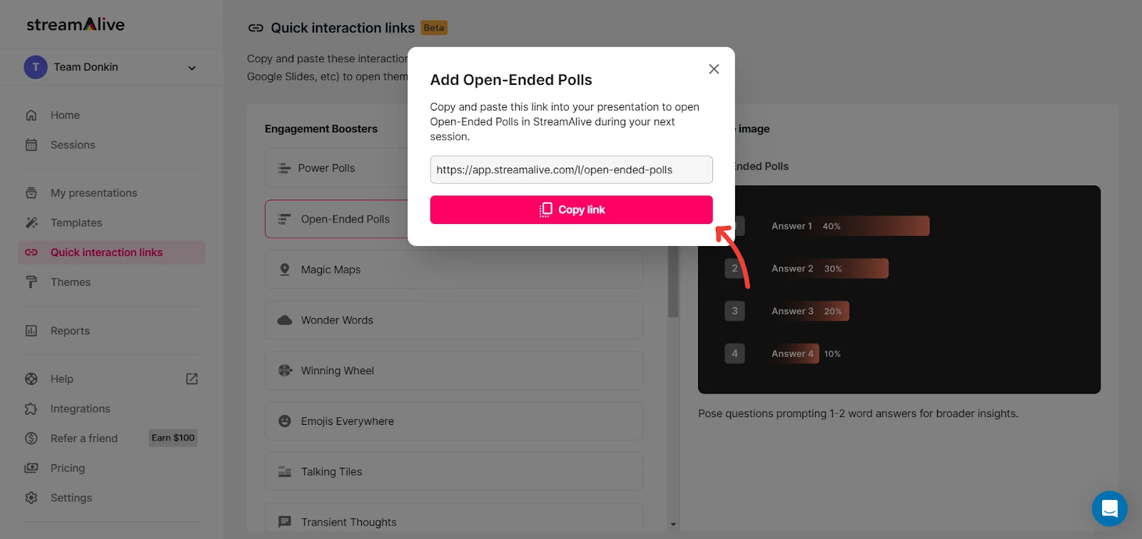 1. Go to the Quick Interactions Links tab and click on "Show link" next to Open-Ended Polls.