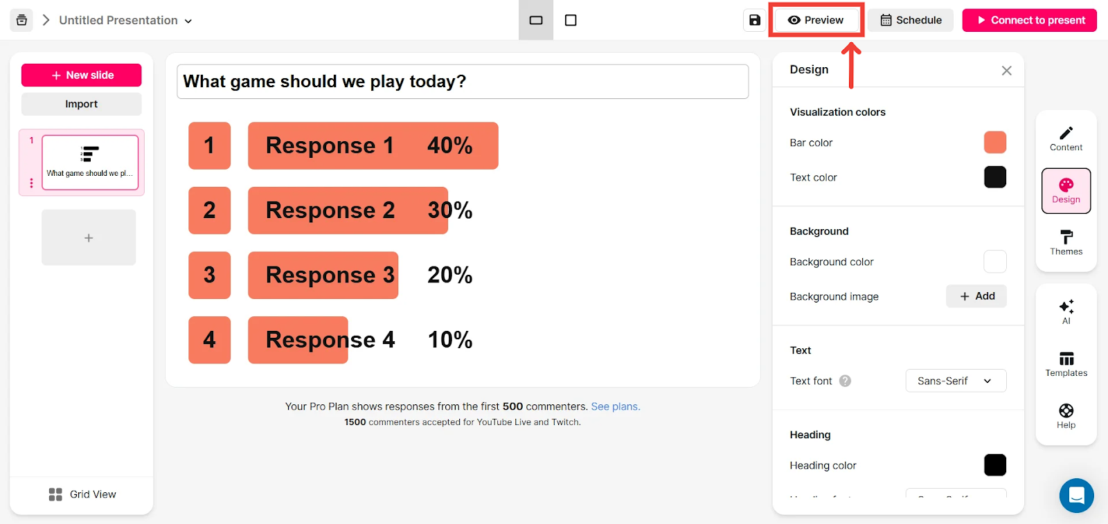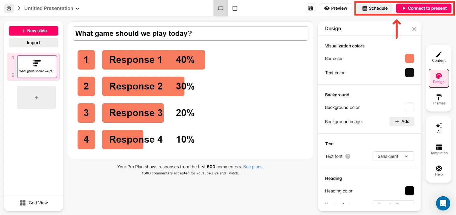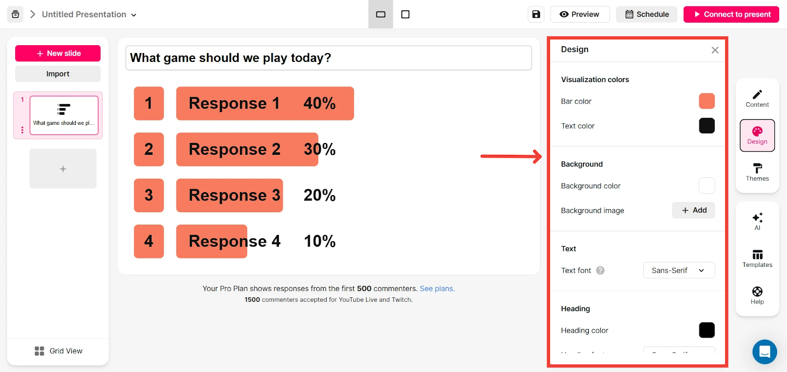 You can also edit the design of the interactions, like the visualization colors of the poll, background color, heading color/font, and so on.