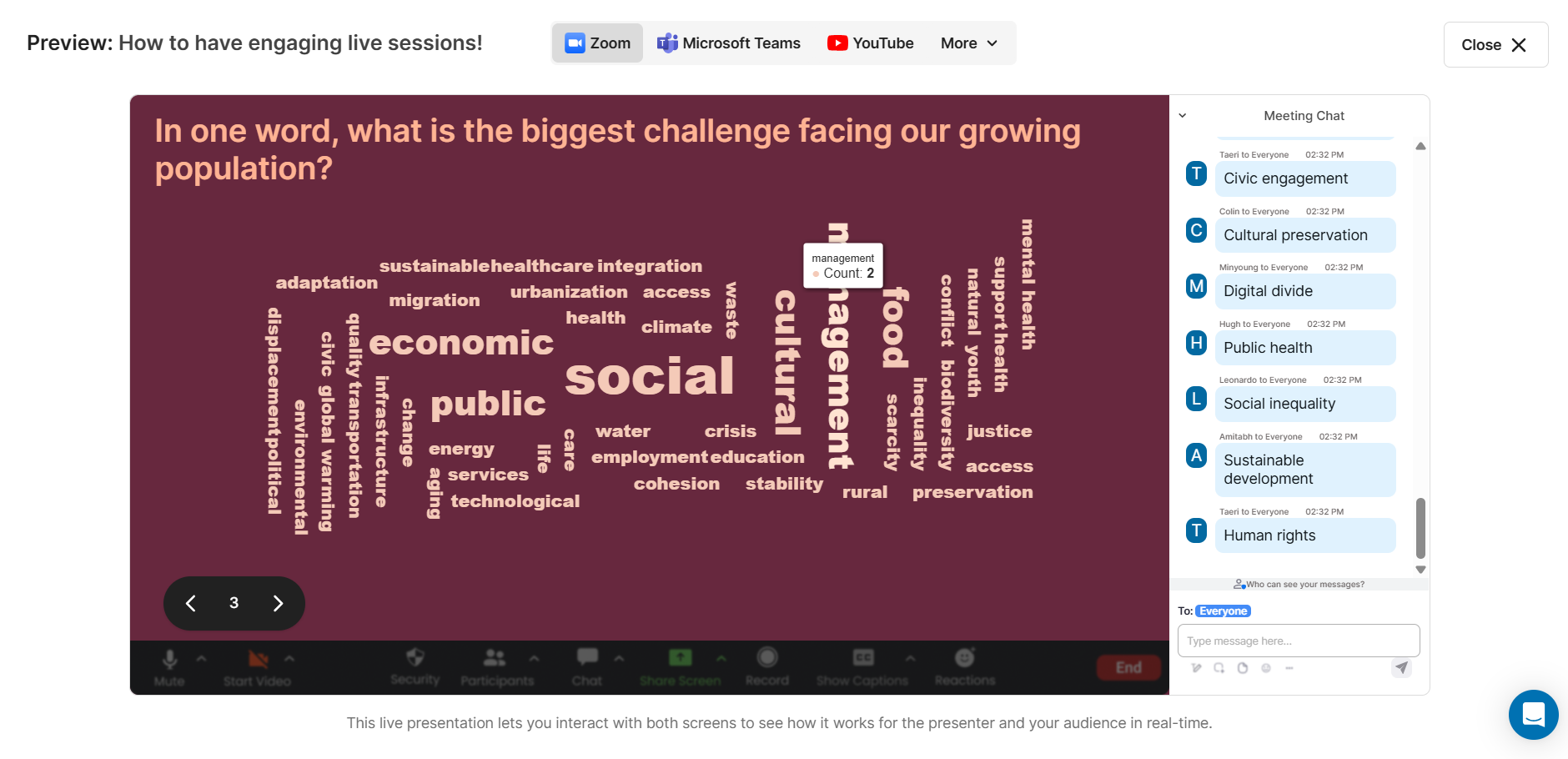 With just a few clicks, you can explore different classic themes like Light, Dark, and Chroma or opt for scenic themes such as Earth, Christmas, or Waves. Changing your theme helps create the right atmosphere, whether you're running a formal webinar, a lively live stream, or an interactive workshop.