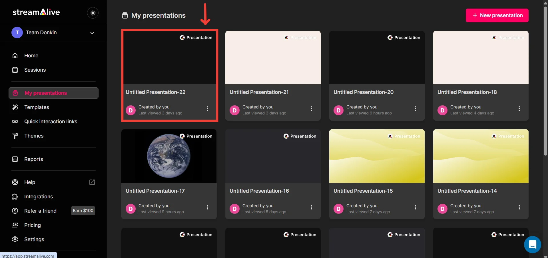 (If you do not have one prepared, click on the + New presentation button to create one. Read this article to learn how to create your presentation)