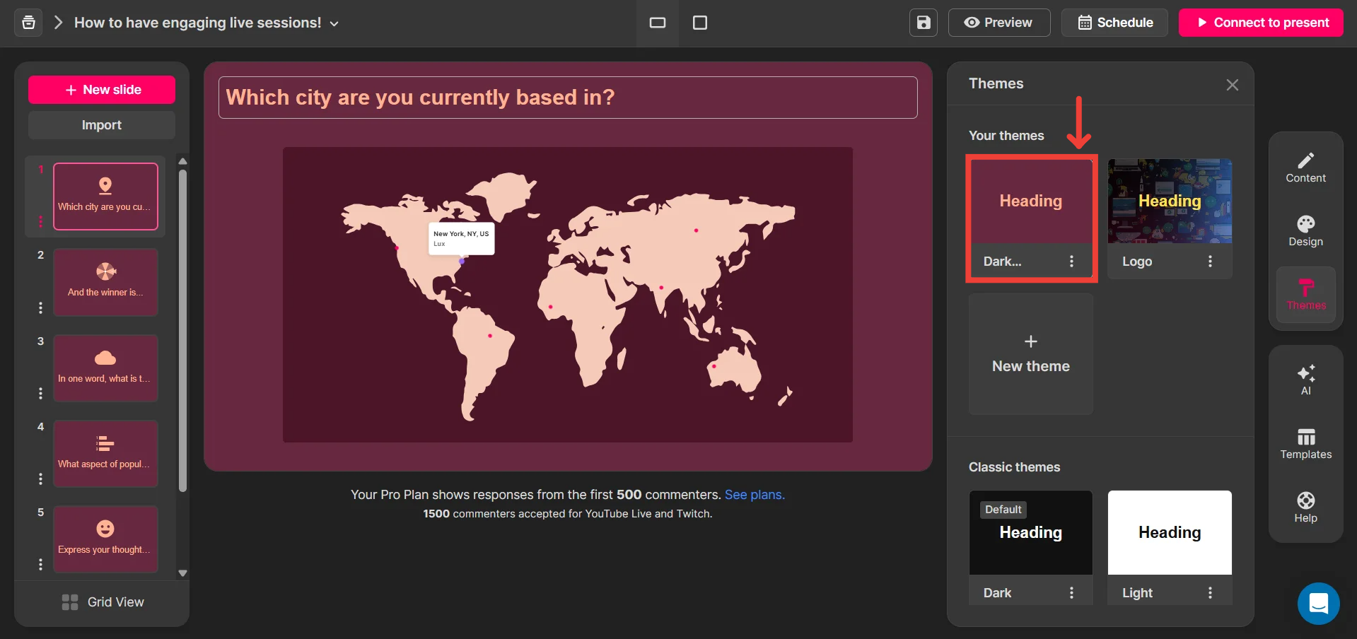 StreamAlive offers a preview option, allowing you to see how your presentation will look with the new theme before applying it.