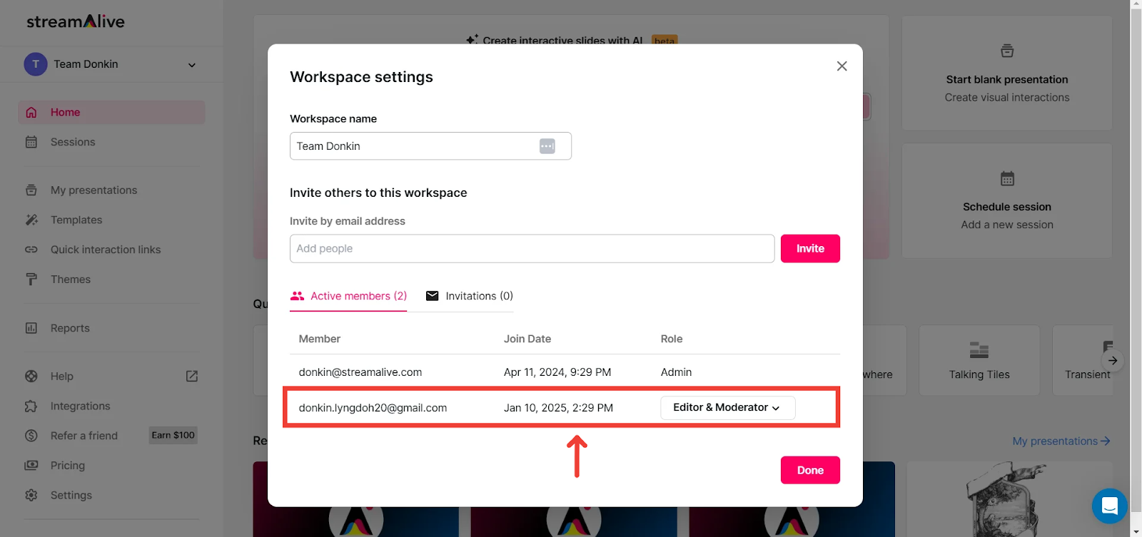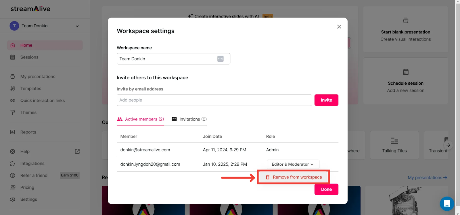 Adding team members to your workspace allows you to share the workload of creating presentations, scheduling sessions, configuring settings, and analyzing session data. Similarly, removing members when roles or responsibilities change helps maintain a streamlined team.